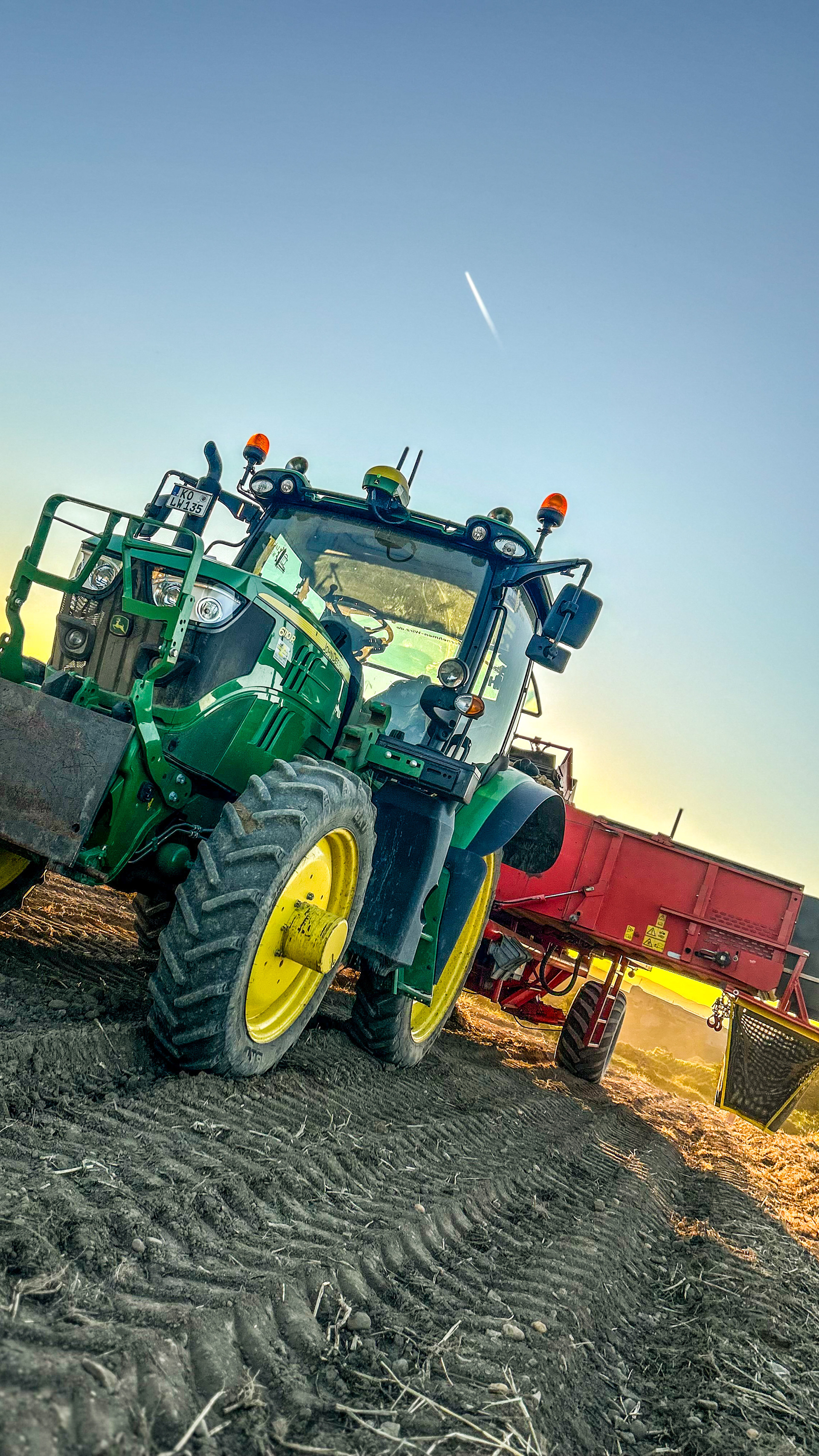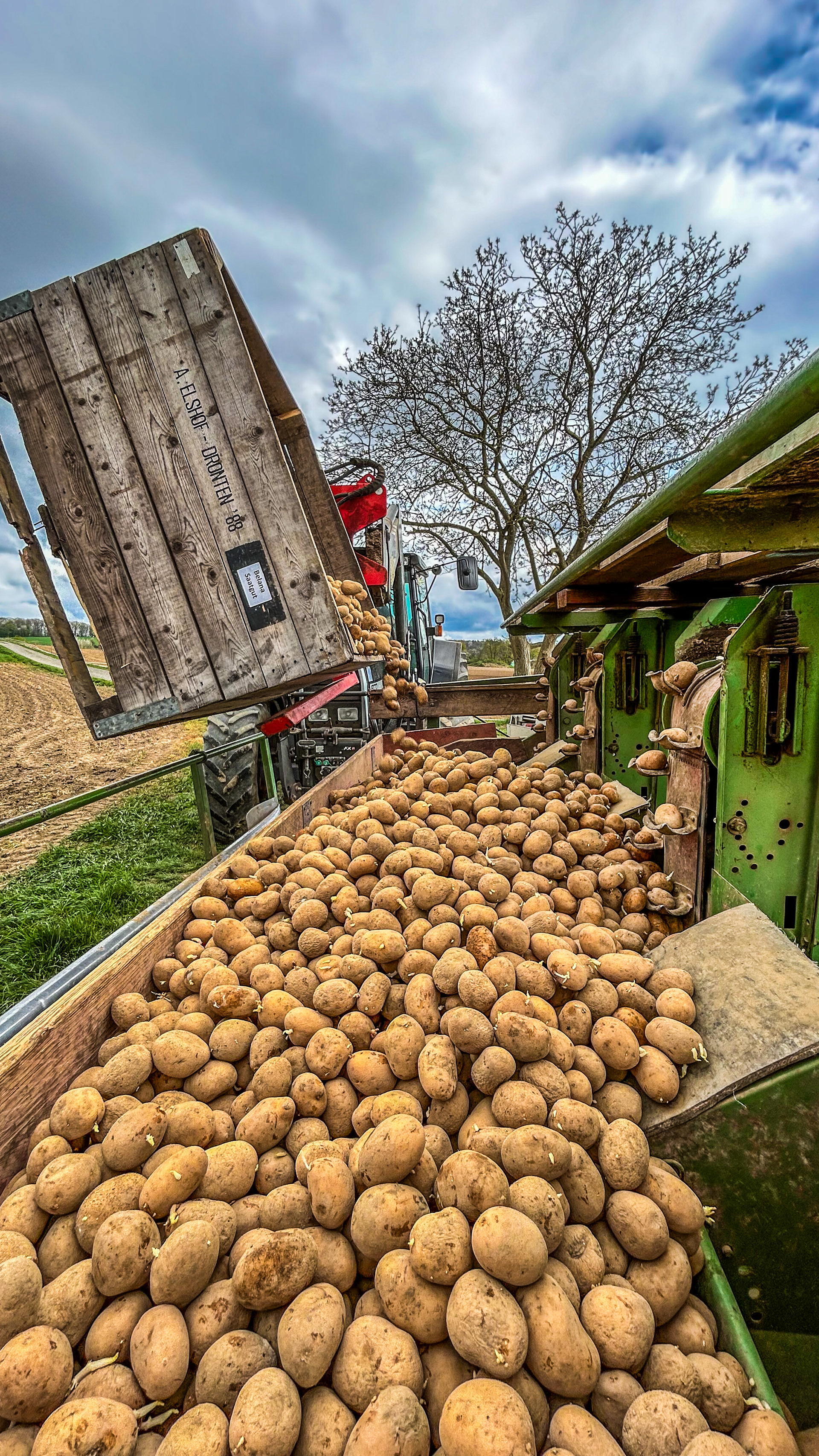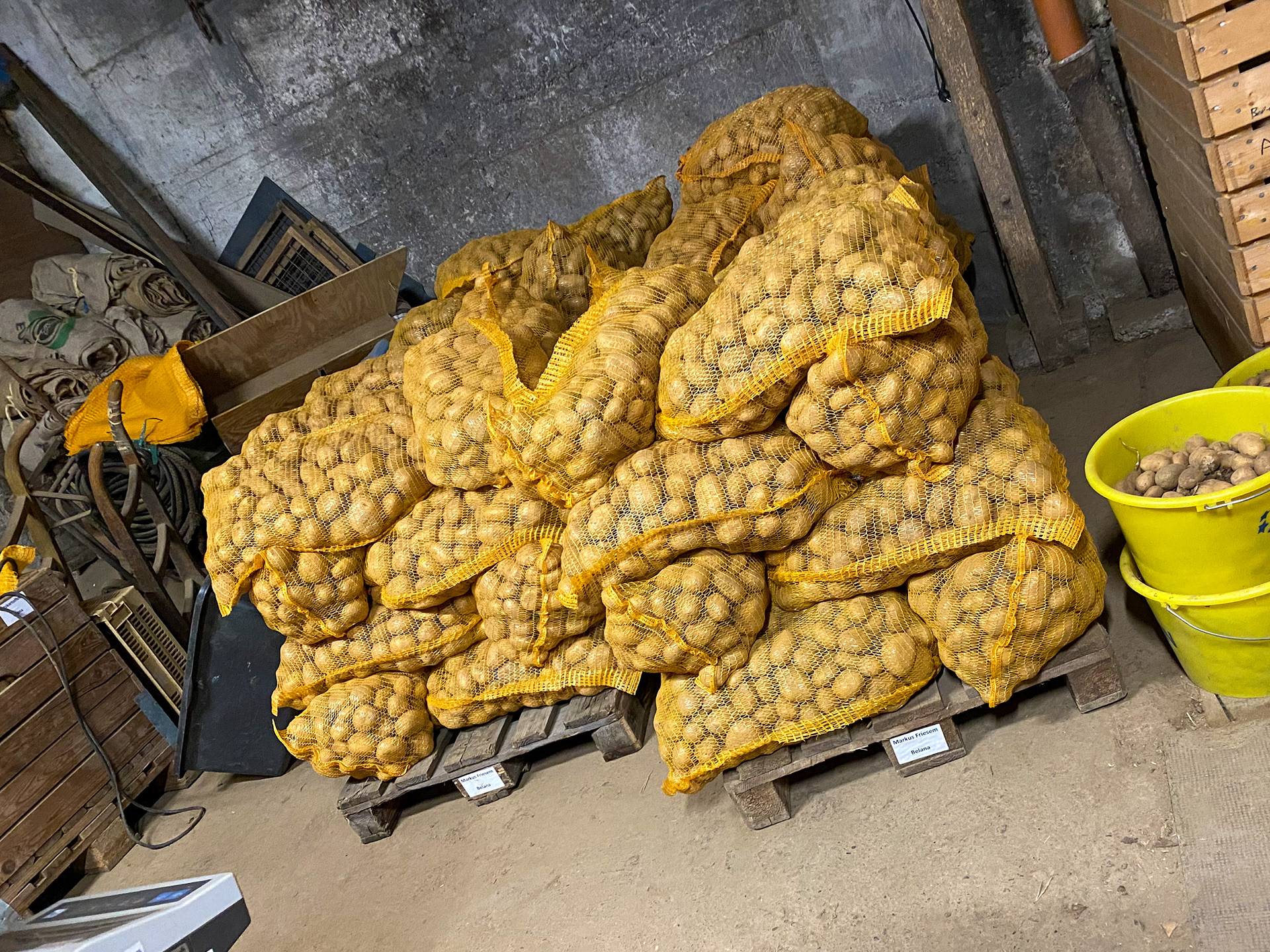 Während im Spätsommer noch der Mähdrescher seine letzten Bahnen dreht, wird parallel schon der Kartoffelvollernter angehangen, denn nun sind auch die mittleren und späten Kartoffelsorten erntereif. Die Kartoffeln werden auf der Maschine vorsortiert und danach in Holzkisten in dunklen gekühlten Hallen eingelagert, um ganzjährig für Sie im Regal zur Verfügung zu stehen. Zeitgleich wird bei uns eifrig Körnermais mit der Schlauchpresse verarbeitet und schon die Zwischenfrucht auf den Feldern für die nächste Saison gesät.