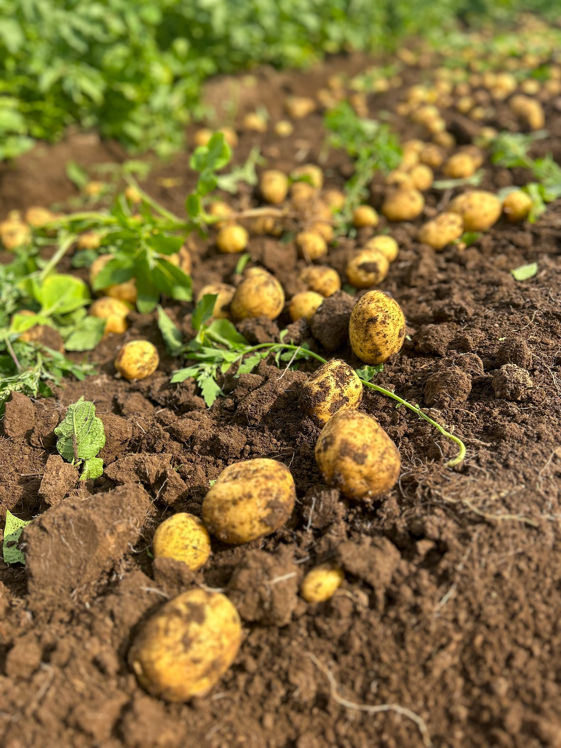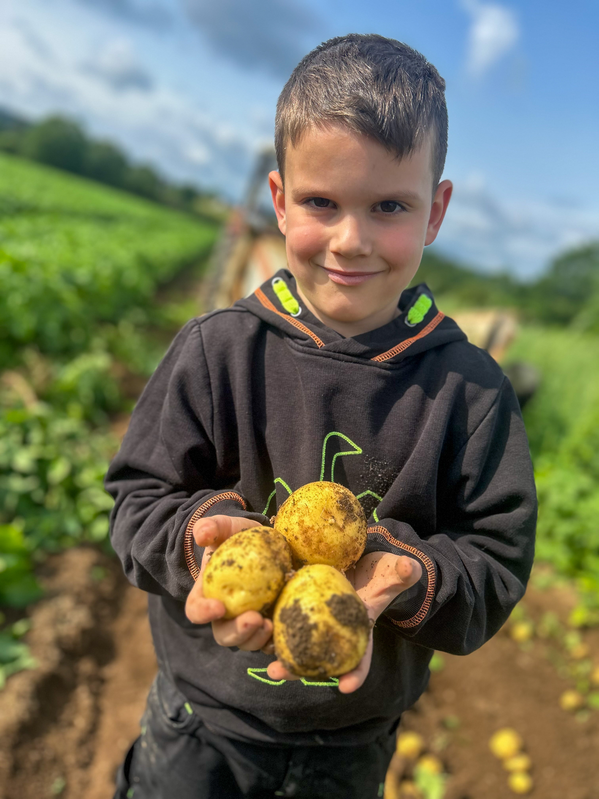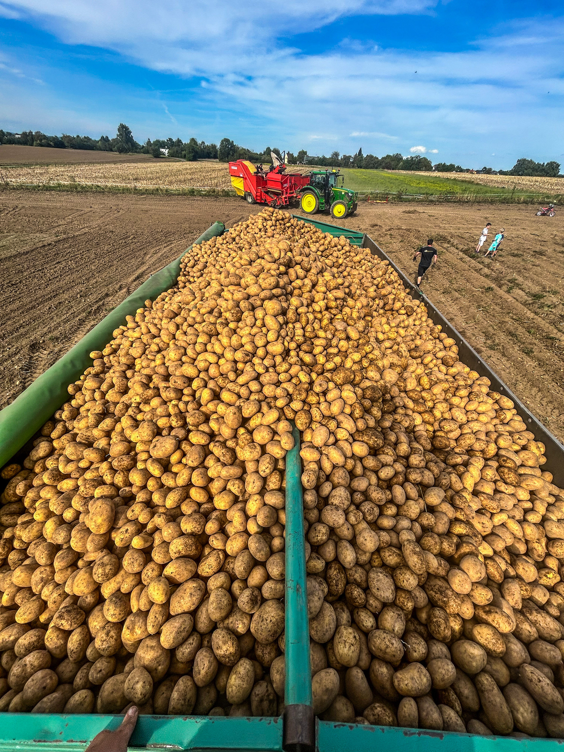 Im frühen Sommer beginnt bei uns die Frühkartoffel Ernte, die ersten Knollen werden maschinell freigelegt und daraufhin per Hand aufgesammelt. Kurz darauf geht es auch endlich mit der Getreideernte los, während anfangs die Wintergerste gerne für Futtergetreide mit der Schlauchpresse in einen Folienschlauch gemahlen wird, werden danach auch die weiteren Fruchtarten wie beispielsweise Weizen, Raps & Bohnen geerntet.